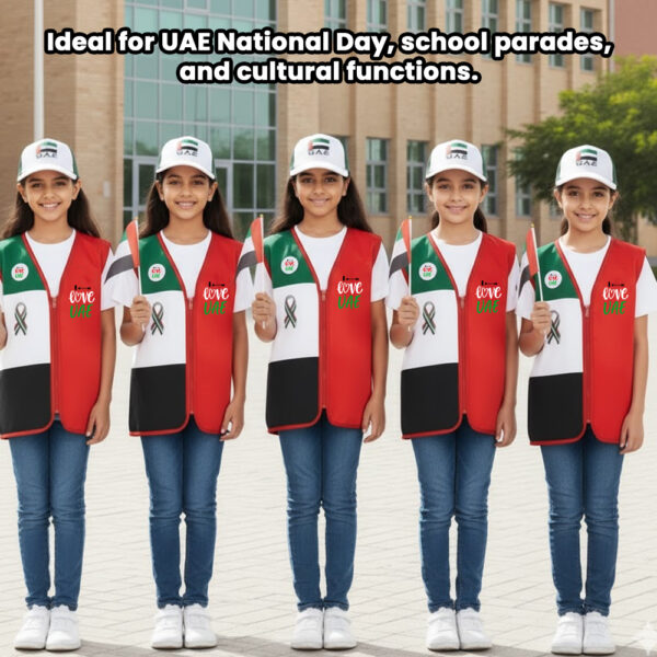 UAE Flag Vest: Made from soft and breathable fabric, this UAE Flag Vest features the vibrant UAE flag design. It’s designed for all-day comfort, allowing your child to move freely and enjoy the celebrations.