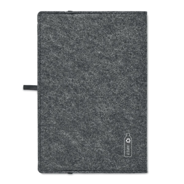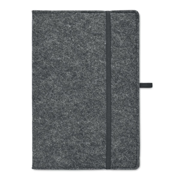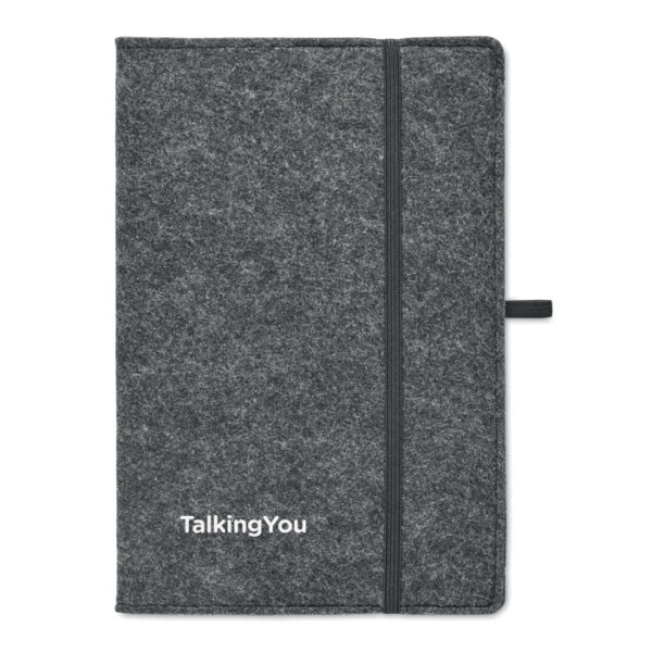 Durable RPET felt cover with a sophisticated finish: The dark grey RPET felt cover not only adds to the notebook’s durability but also enhances its corporate appeal with a sophisticated and modern look. The texture of the felt cover gives a premium feel, making it an excellent choice for executive gifting, business events, and promotional campaigns. Its sturdy construction ensures longevity, protecting the inner pages from damage and ensuring the notebook remains in pristine condition over time. The neutral color scheme aligns with professional aesthetics, making it suitable for both formal and casual corporate environments. Ideal for conferences, training sessions, and business retreats, this notebook serves as an elegant yet practical tool for professionals. Companies seeking an eco-friendly, high-end giveaway will find this notebook a valuable addition to their branding strategy.